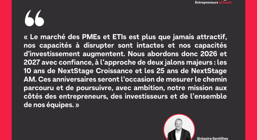 Informations financières : Le contenu de ce site est exclusivement destiné à des investisseurs avertis relevant de l’une des catégories listées à l’article 423-49 du RGAMF et visés dans les règlements des véhicules gérés par NextStage AM. Il ne constitue pas une offre publique de souscription, ni une recommandation d’achat ou de vente de titres financiers. Les informations présentées ne doivent pas être considérées comme des conseils d’investissement personnalisés.