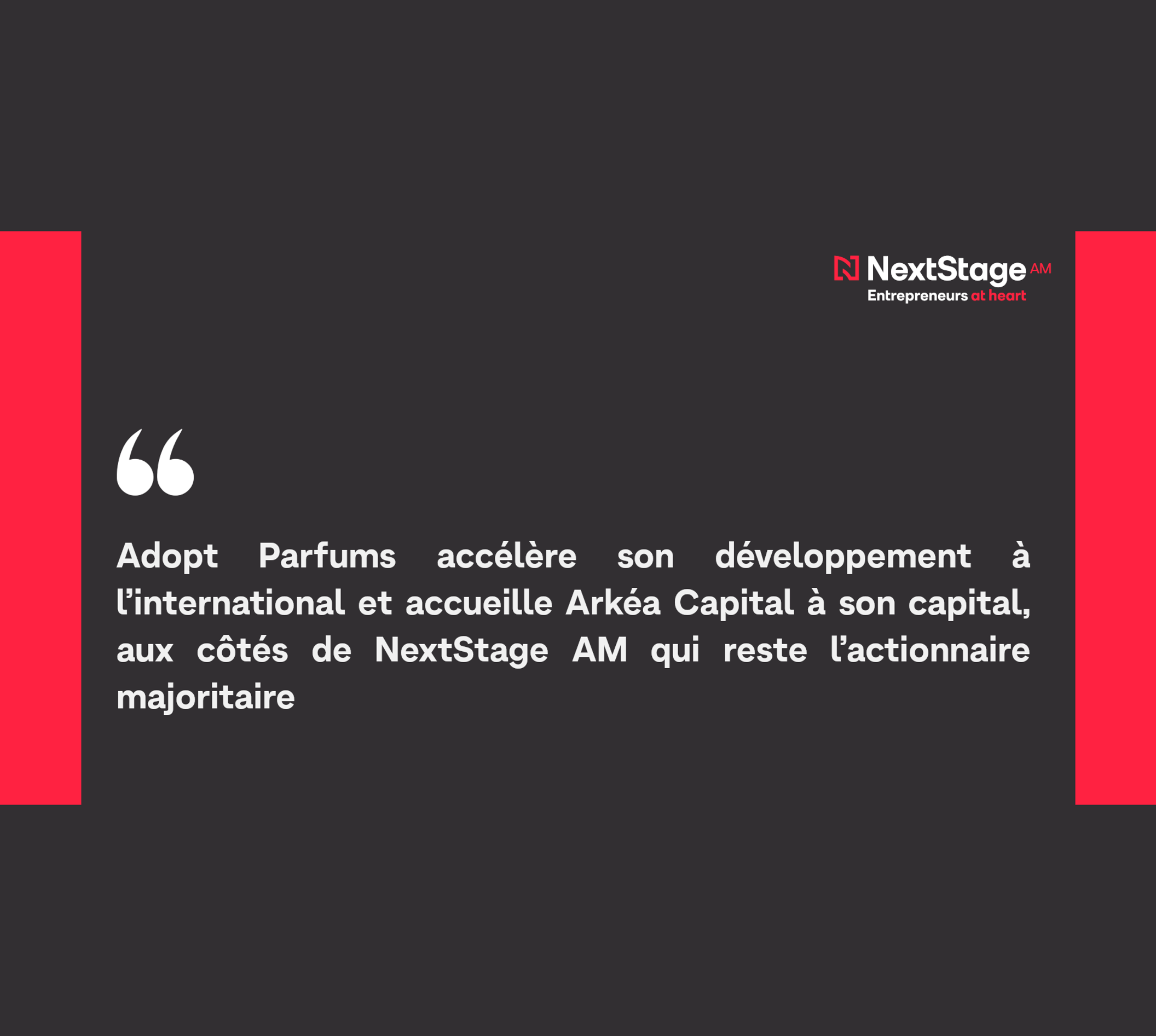 Paris, le 29 avril 2025 – Adopt Parfums, la marque leader du parfum en France accélère son développement à l’international et accueille Arkéa Capital, société de gestion du Crédit Mutuel Arkéa, à son capital aux côtés de ses actionnaires historiques, NextStage AM, et de l’équipe d’entrepreneurs emmenée par Frédéric Stoeckel. La marque Adopt Parfums, leader du parfum en France en volume, affiche de fortes ambitions de croissance en France et à l’international avec la poursuite de l’objectif de disrupter le marché du parfum et de consolider sa position d’acteur de référence du parfum d’une qualité absolue « made in France », à un prix accessible. NextStage AM, à travers le programme d’investissement « Pépites & Territoires by AXA France et NextStage AM » et le véhicule NextStage Evergreen, demeure l’actionnaire majoritaire d’Adopt Parfums.