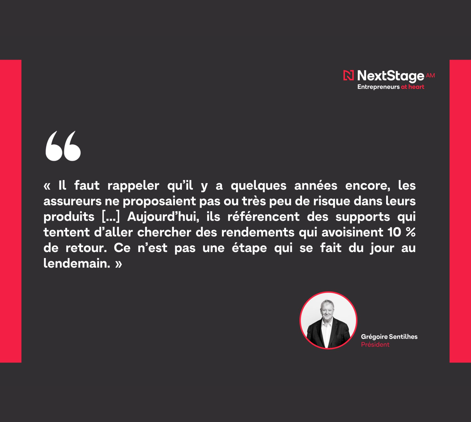 « Il faut rappeler qu’il y a quelques années encore, les assureurs ne proposaient pas ou très peu de risque dans leurs produits […] Aujourd’hui, ils référencent des supports qui tentent d’aller chercher des rendements qui avoisinent 10 % de retour. Ce n’est pas une étape qui se fait du jour au lendemain. » rappelle Grégoire Sentilhes, Président et Co-Fondateur de NextStage AM.