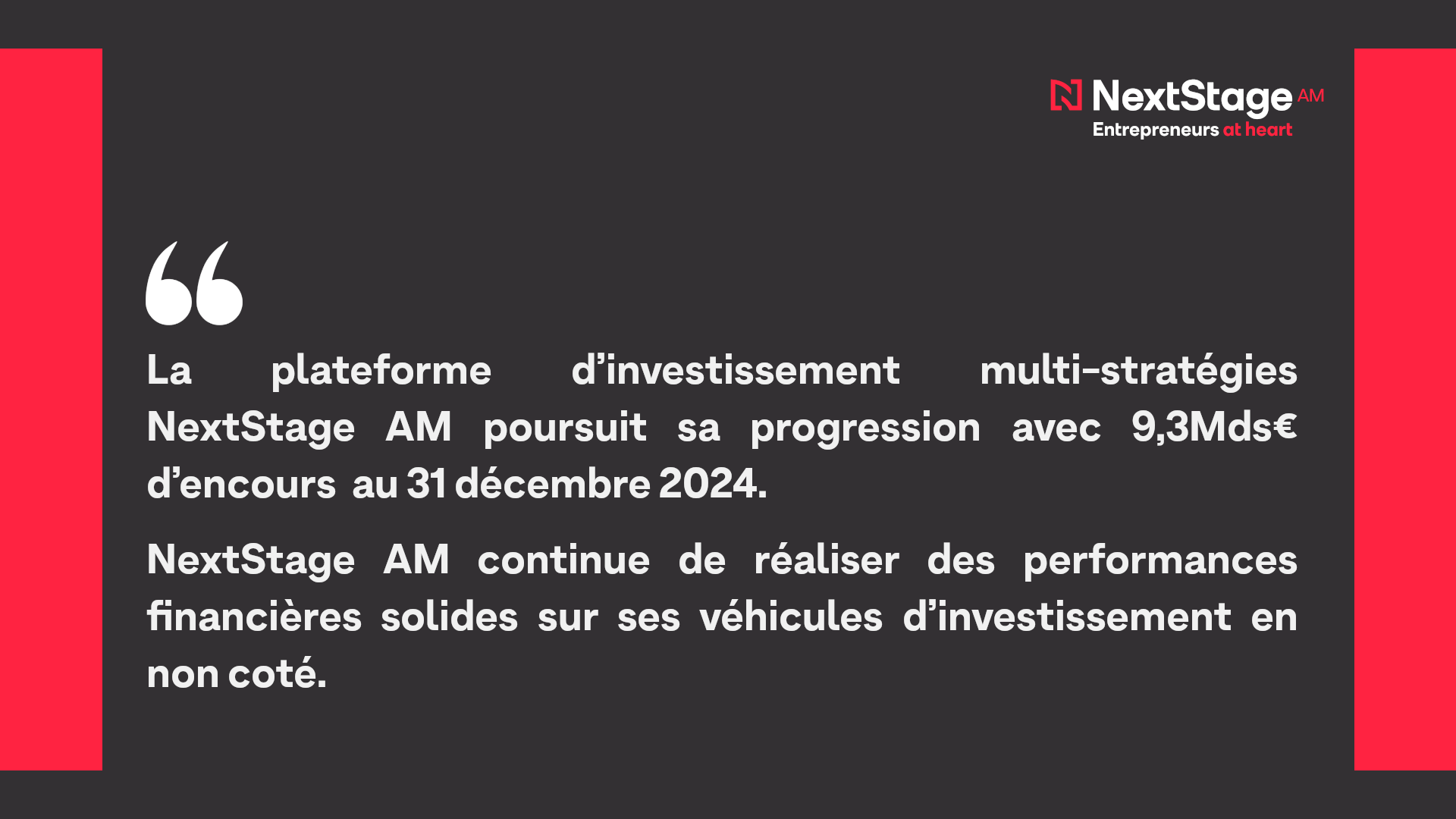 Société de gestion indépendante basée à Paris, agréée par l’AMF sous le numéro GP 02012, NextStage AM cultive depuis sa création en 2002, une philosophie « d’entrepreneurs-investisseurs ». NextStage AMest l’un des pionniers et spécialiste du capital développement innovant et patient en France. NextStage AM a développé étape par étape, une plateforme de private equity, multi-stratégie qui représente en termes d’encours 9,3 Mds€ au 31 décembre 2024. (Encours représentés directement par NextStage AM et indirectement par Atream et Linxea (encours conseillés), deux participations détenues par NextStage Evergreen). NextStage AM investit dans un nombre limité de PMEs et ETIs (84 sociétés en portefeuille au 31/12/2024), françaises et européennes, innovantes, et de croissance, auxquelles elle apporte une expertise entrepreneuriale d’investisseur et un accompagnement opérationnel fort pour réussir leur transformation. NextStage AM accompagne dans la durée ces PMEs & ETIs inscrites dans la santé intelligente, l’innovation environnementale et la transformation digitale. Elle leur donne les moyens d’accélérer leur développement et leur capacité d’innovation pour devenir les « Championnes » de leurs marchés, tant en France qu’à l’international, par croissance organique et/ou externe. https://www.nextstage-am.com