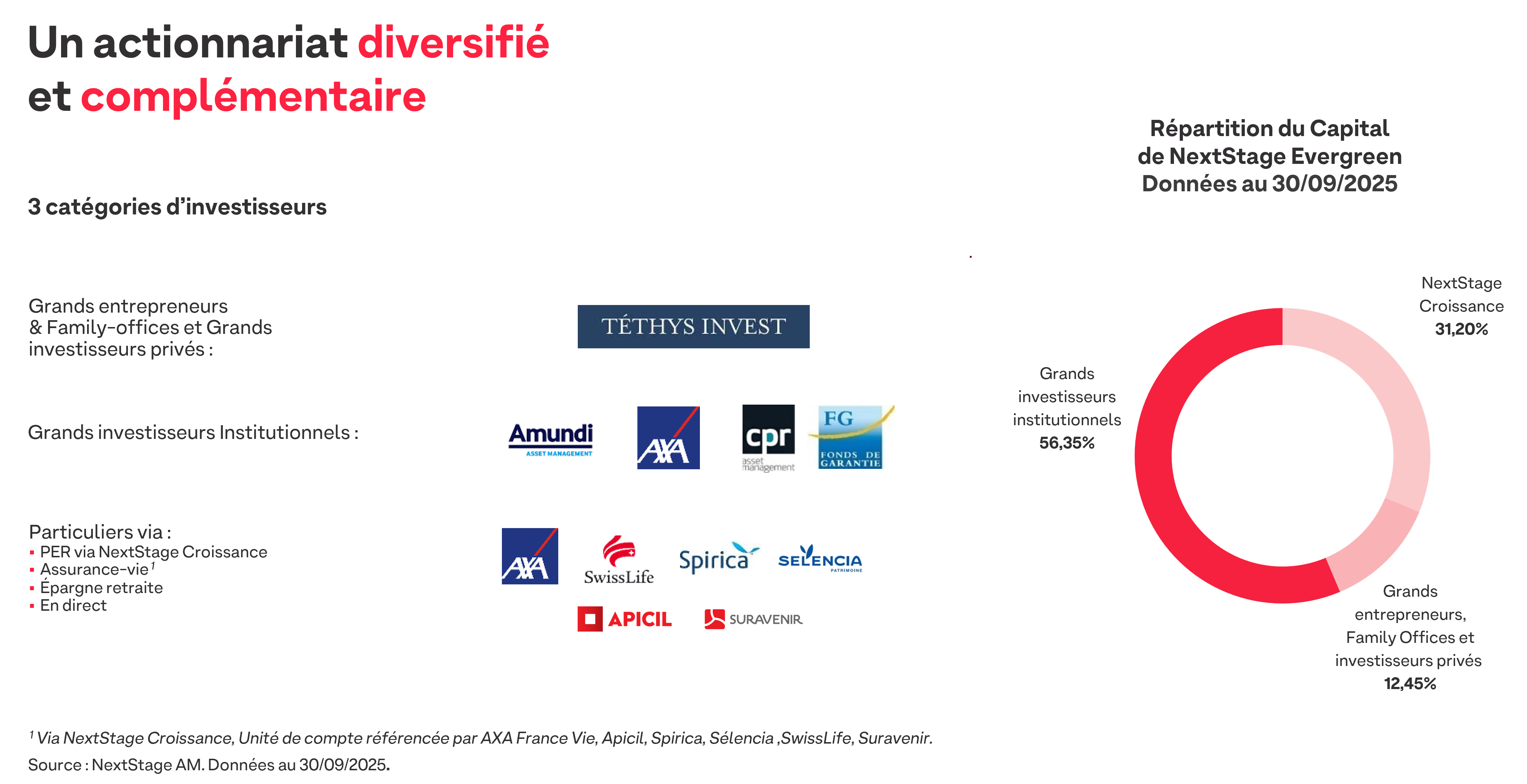 NextStage Evergreen réunit une large diversité d’investisseurs : investisseurs institutionnels, family offices, grands investisseurs privés, ainsi que des particuliers via des contrats d’assurance vie et des PER proposant l’UC NextStage Croissance.