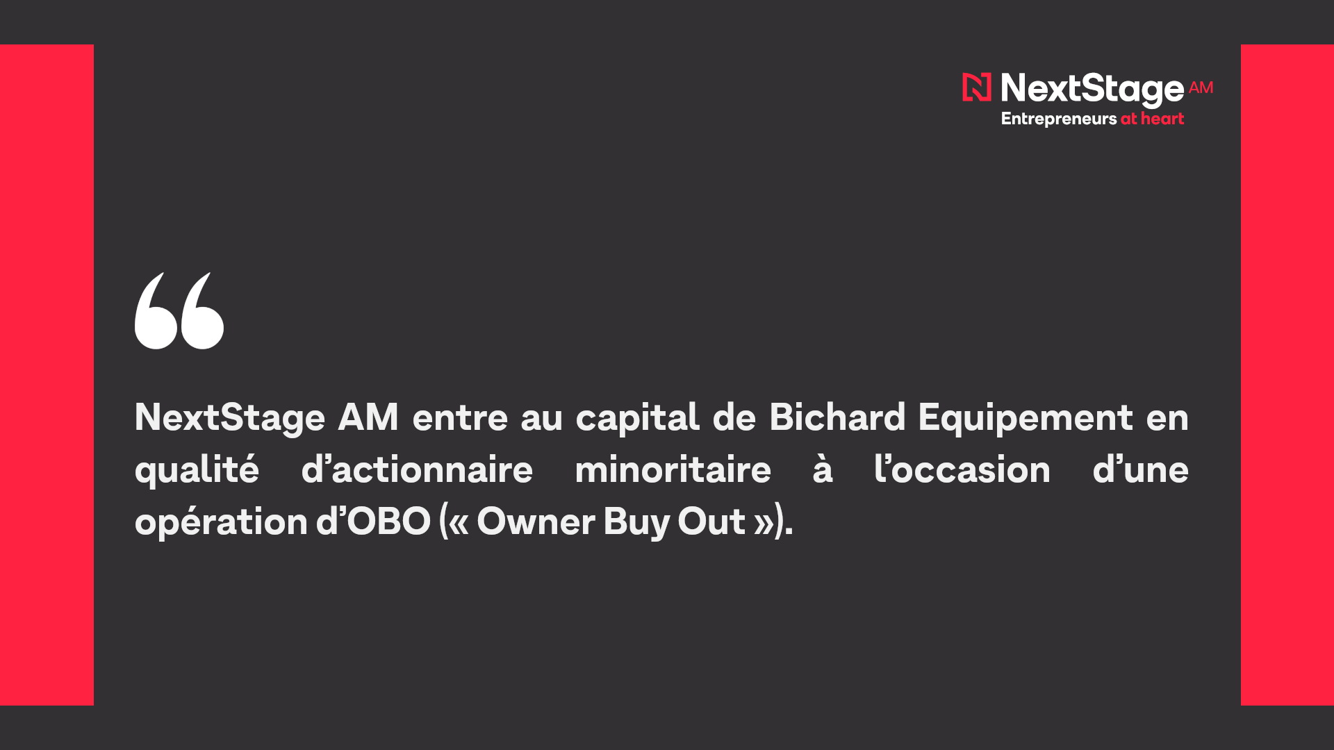 Paris, le 18 avril 2025 – NextStage AM, acteur de référence dans le capital-développement, entre au capital de Bichard Equipement en qualité d’actionnaire minoritaire à l’occasion d’une opération d’OBO (« Owner Buy Out »). Les dirigeants, Laurent Hubé et Philippe Pelvé, restent majoritaires à l’issue de l’opération qui associe également Stéphan Massonneau, Directeur d’Action Froid, société acquise par Bichard Equipement en 2022. Cette prise de participation de NextStage AM, à travers les fonds FPCI NextStage Capital Entrepreneur II, FPCI NextStage Capital Entrepreneur III et FPCI Amundi Capital Entrepreneurs, va permettre d’accélérer la stratégie de croissance du groupe.